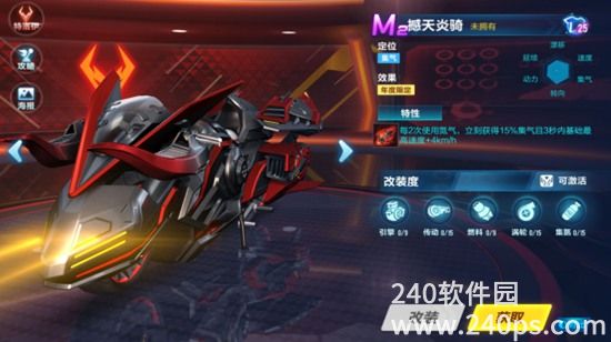 撼天炎骑有着十分霸气张扬的外观,同时还有无比优秀的基础性能,搭配强大的转向能力和集气特性,让车手在各种赛道中都能得心应手。喜欢这辆摩托的车手不要错过哦。