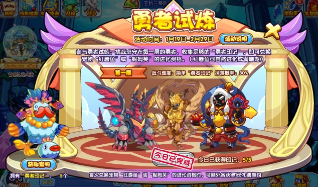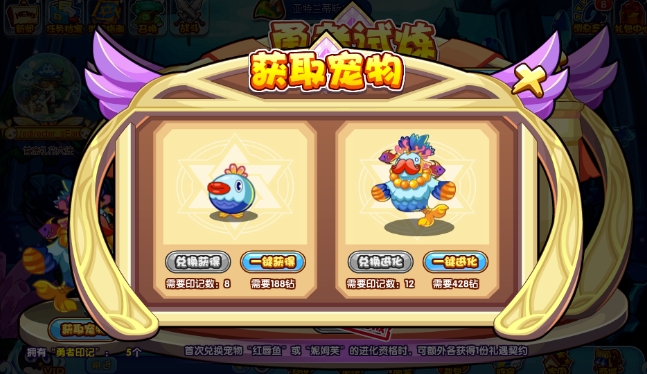 拿到足够的勇者印记就可以获取宠物啦!红唇鱼:8枚勇者印记、妮姆芙进化资格:12枚勇者印记。
