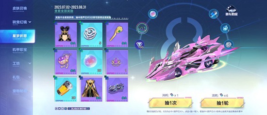 7月2日-8月31日,A车七彩仙葫携尘缘景愿动作套装首发上架寻宝-星梦祈愿,车手们可以使用祈愿卡(售价30钻石/个)进行点亮获取。