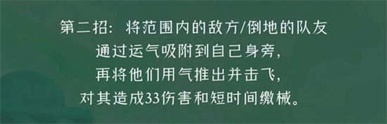 第二招:将范围内的敌方/倒地的队友通过运气吸附到自己身旁,再将他们用气推出并击飞,对其造成33伤害和短时间缴械。