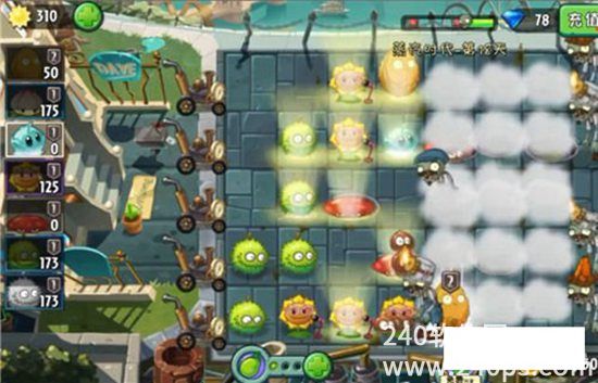 歌手向日葵、平顶菇、板栗小队、冰冻生菜、坚果、能量花等。因为这一关还是有锅炉僵尸,所以带上了冰冻系的植物,至于平顶菇,蒸汽时代常常会用上的植物上会用到的植物,不仅能防止毒雾的扩散还能阻止僵尸从下水道爬上来。