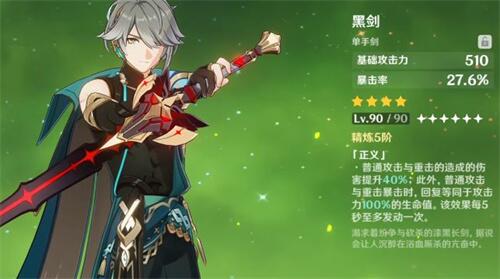 黑剑:这把武器是属于大月卡氪金获取的,武器的词条非常的优秀,510的基础攻击力和27%的暴击率使得它非常的反应,而武器特效是增加普攻和重击的伤害,而艾尔海森是属于驻场主c,所以加成是完全可以吃满的。