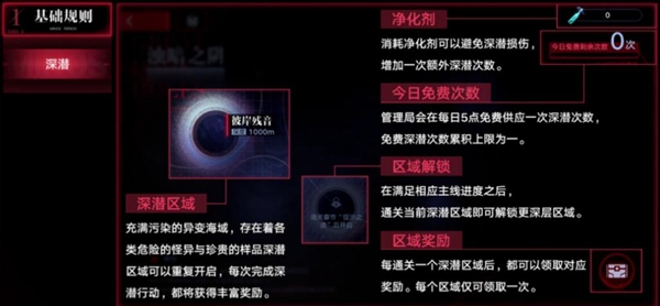 3、每天玩家有一次免费进行深潜的次数,此外需要消耗净化剂来获取挑战机会。完成一个区域之后还可以获得对应的奖励。