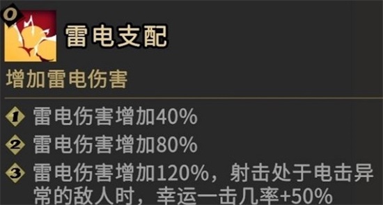 5.最后是雷,(触发这个你需要先给怪挂上一层雷元素异常[前置],然后后续再造成伤害才能触发;再就是增加幸运一击,这里把雷排最后是因为猫天赋没有加幸运的,所以这点幸运没啥大用,除非配合秘籍能提高一点)。