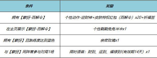 1、购买礼包必得红蓝对决(1日),可额外随机获得以下之一:蒙犽专属击败-百解令、专属拖尾-百解令、百解令荣耀播报、龙鼓争鸣、归虚梦演(蒙犽)、皮肤碎片x2、荣耀积分x20、新品皮肤抽奖券x1,累计225次必得全部局内特效。