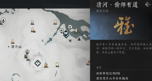 1、玩家需要去到隐月山的右下方位置(如下图所示),找到仇越海对话,接取清河·偷师有道残章任务。