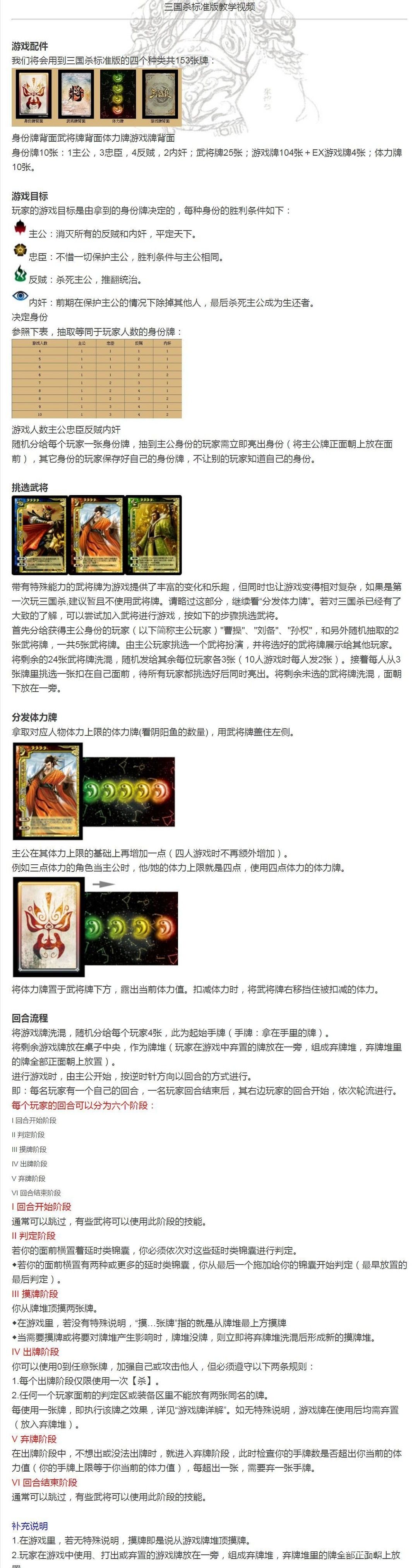 根据卡牌不同内容和作用我们将其分为【身份牌】、【武将牌】、【体力牌】、【基本牌】、【锦囊牌】、【装备牌】。