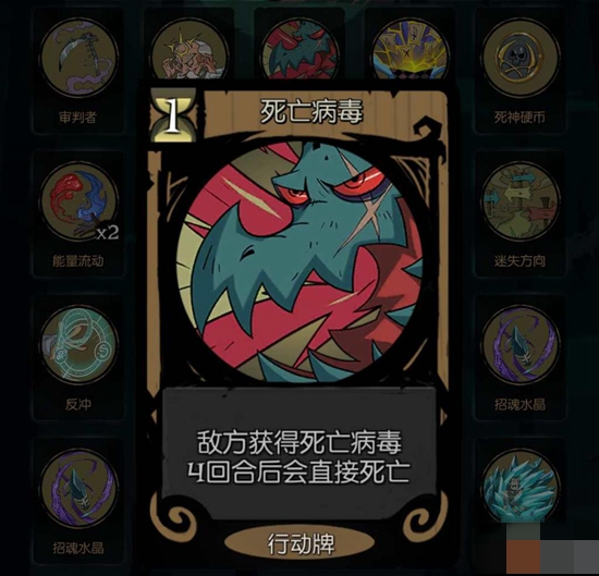 思路:消耗10点审判获得【死神降临】,每多10点审判,【死神降临】将有1次额外的触发机会,因此选卡的时候可以拿加审判的,配合【死神视角】能实现很好的输出,其他的卡能用汲取以及过牌的确保生存。