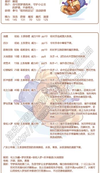 3、简析:守梦系列的第二只,负责守护公主梦境的绵绵。精力物攻都还不错。梦往笑意只有在对方无强化时才删除pp,加上自身防控先手较低,注定不是pvp的料了。大概可以用安枕入梦加折冲奋进打打普通boss,不过还是收藏就好。