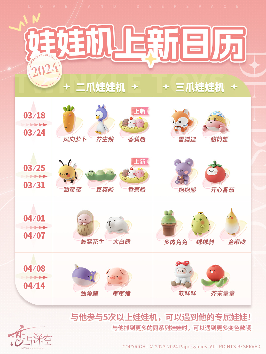 4月1日~4月7日,它将准时出现在三爪娃娃机中和大家再会,后续也将跟随常驻娃娃轮换出现。