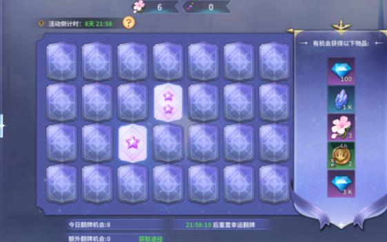 活动内容:使用1个幸运之瓶可以翻一次卡牌,星级越高奖励越好,每天可以翻的卡牌上限为10个(即今日翻牌机会:10),参与超值礼包活动可以获得额外翻牌机会哦~