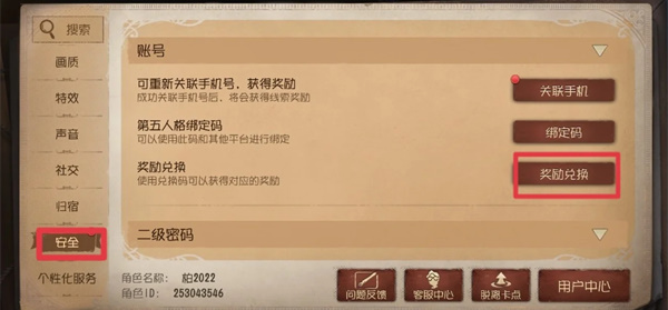 第三步:最后我们在安全界面点击【奖励兑换】选项,然后将上方的兑换码复制粘贴到兑换框中并点击确定即可领取奖励。