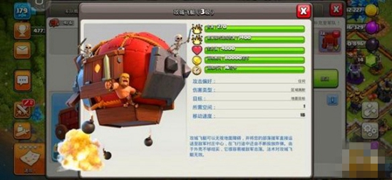 攻城飞艇:攻击偏好:任何,伤害类型:区域溅射,目标:地面目标,所需空间:1,移动速度:18,攻城飞艇可以无视地面障碍,并将您的部落援军直接运送至敌军村庄中心,在飞行的途中还会不断投放炸弹。