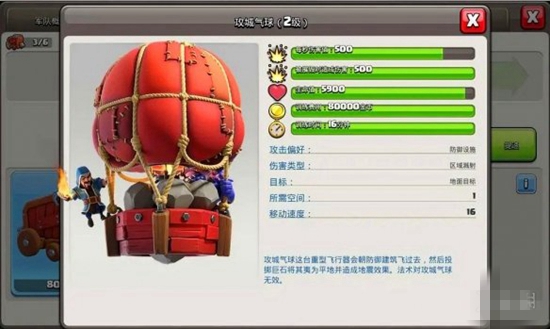 攻城气球:攻击偏好:防御设施,伤害类型:区域溅射,目标:地面目标,所需空间:1,移动速度:16,攻城气球会朝防御建筑飞过去,然后投掷巨石将其夷为平地并造成地震效果。