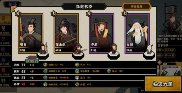 燕国军心大于60时,其他国家灭亡,燕国用间等级+1,燕国战斗力+10%。(这个没办法,只能尽量提升燕国灭亡的顺序)