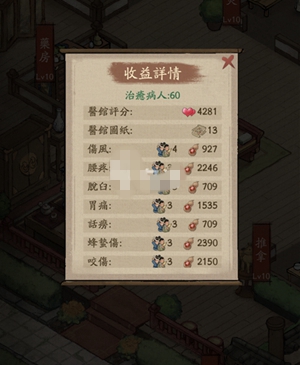 想要获得在医馆图纸就需要大量诊病人,点击接诊按钮后会自动进行治疗。每个很长时间就会有病人来就医,如果等不及也可以使用病人手册吸引3名病人就医。接诊的妄想病患者后可增加125点医馆评分,556点医术。