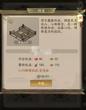 医馆共有推拿,刮痧,药房,火罐,艾灸,布气,药浴,汗蒸,炼丹十个科室,当治疗一定数量的病人后即可解锁新的科室。当科室都开启后就需要提升科室的等级解锁个中病症的治疗方法,妄想症属于比较难医治的疾病,需要开启布气科室并达到10级才能解锁