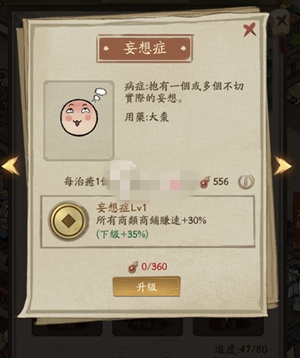 1级妄想症可以增加所有商类商铺赚速30%。第一次升级妄想症治疗等级需要消耗360点医术,第二次升级需要效果870点医术,升级级别越高需要的医术点越多。