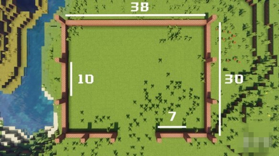 首先,将村民房子全部拆除,用砖块围出长38格、宽30格的地基,并在正前方空出10格作大门,然后如图所示竖立4格高的柱子