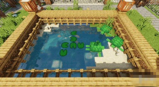 为了使整体看起来更加美观,用橡木台阶和橡木围栏将池子围住,再用睡莲、海草和海晶灯进行点缀,最后将乌龟和鱼儿们请进来,乌龟池就大功告成啦