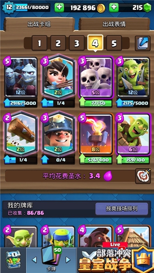 起手思路:卡组在使用上属于偏消耗的组合,所以在开局阶段能够选择的卡牌很多,起手如果有哥布林飞桶或者掘地矿工,可以直接丢出其中的一张主动性消耗,如果没有这两个单位,则选择沉底公主稳场防守即可。