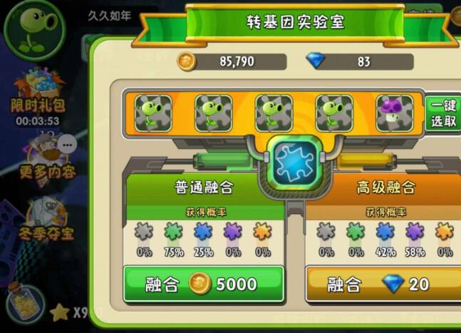 转基因实验室的普通融合大概需要5000金币,而高级融合需要钻石。转基因实验室可以将两个至五个的碎片融合在一起,可以获得不同颜色的植物碎片。普通融合与高级融合得到植物颜色的概率也并不形同。将地刺碎片与弹簧豆碎片结合,普通融合下得到100%的白色植物,而高级融合下得到67%的蓝色植物和33%的紫色植物。