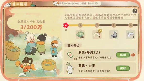 4、玩家捐赠乡票、完成萝愿小事即可获得小红花,在微信或者QQ即可使用。