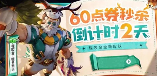 5.最后新年期间有新皮肤登场,也有限定皮肤下线,其中程咬金的60点券勇者皮肤“暖冬絮语”在30号之后下架,该皮肤的设计值得史诗品质,特效也比普通勇者要好一些,除了变色特效,还加入了雪球、礼物等效果,此次下架之后,程咬金“暖冬絮语”不再直售,也就是说下次回归加入积分夺宝或是宝箱抽取获得。