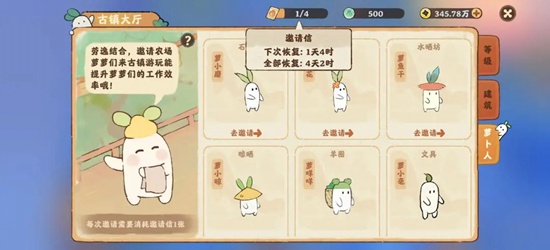 此时会面临一个问题,就是货品不足。解决办法。第一,提前一天到二天备货,主要存制作时间超过2小时的商品。第二,双倍前一日早晨开多产,邀请萝卜(参考第三点),收取制造。双倍当日早起一点,在多产结束前,再收一波制造。第三,古镇里存一下邀请函,叠加产出物双倍的概率。第四,准备香丸,针对订单需要加速生产,6倍速香丸针对长时间生产物,低倍数香丸用于原料供应。