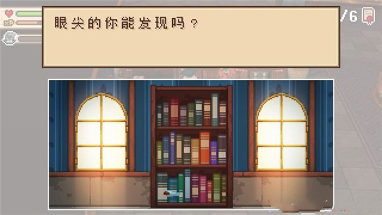 图书馆西南角书架的任务谜题为“找不同”,答案为底下一排第三本书。