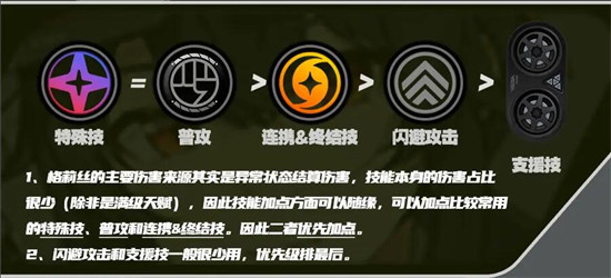 2、格莉丝的主要伤惠来源其实是异常状态结算伤害,技能本身的伤害占比很少(除非是满级天赋),因此技能加点方面可以随缘,可以加点比较常用的特殊技、普攻和连携&络结技。因此二者优先加点。