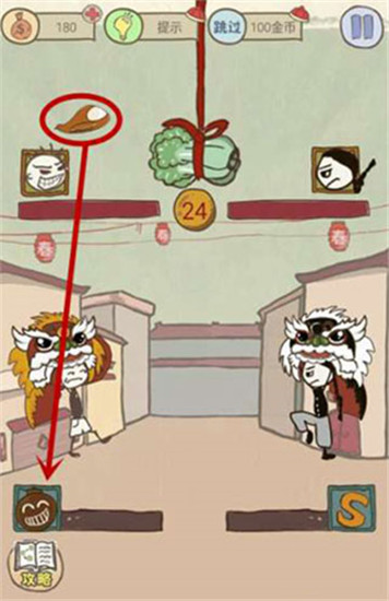 10、拖动屏幕上的红包到最右边的动物上面,就会出现一只凶狠的年兽。