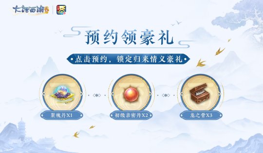 即日起《大话西游:归来》预约抢先开启,现在参与预约并成功的玩家除了在预约后,可第一时间获取游戏一手消息之外,更将在都将在游戏公测时获豪华预约礼包一份!内含丰厚的游戏道具奖励,包括:聚魄丹*1、初级亲密丹*2、龙之骨*3。