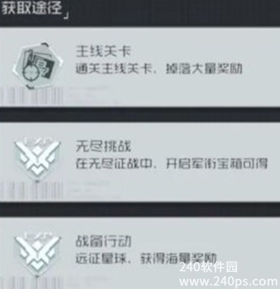 2、无尽挑战:在无尽征战中,开启军衔宝箱可获取。