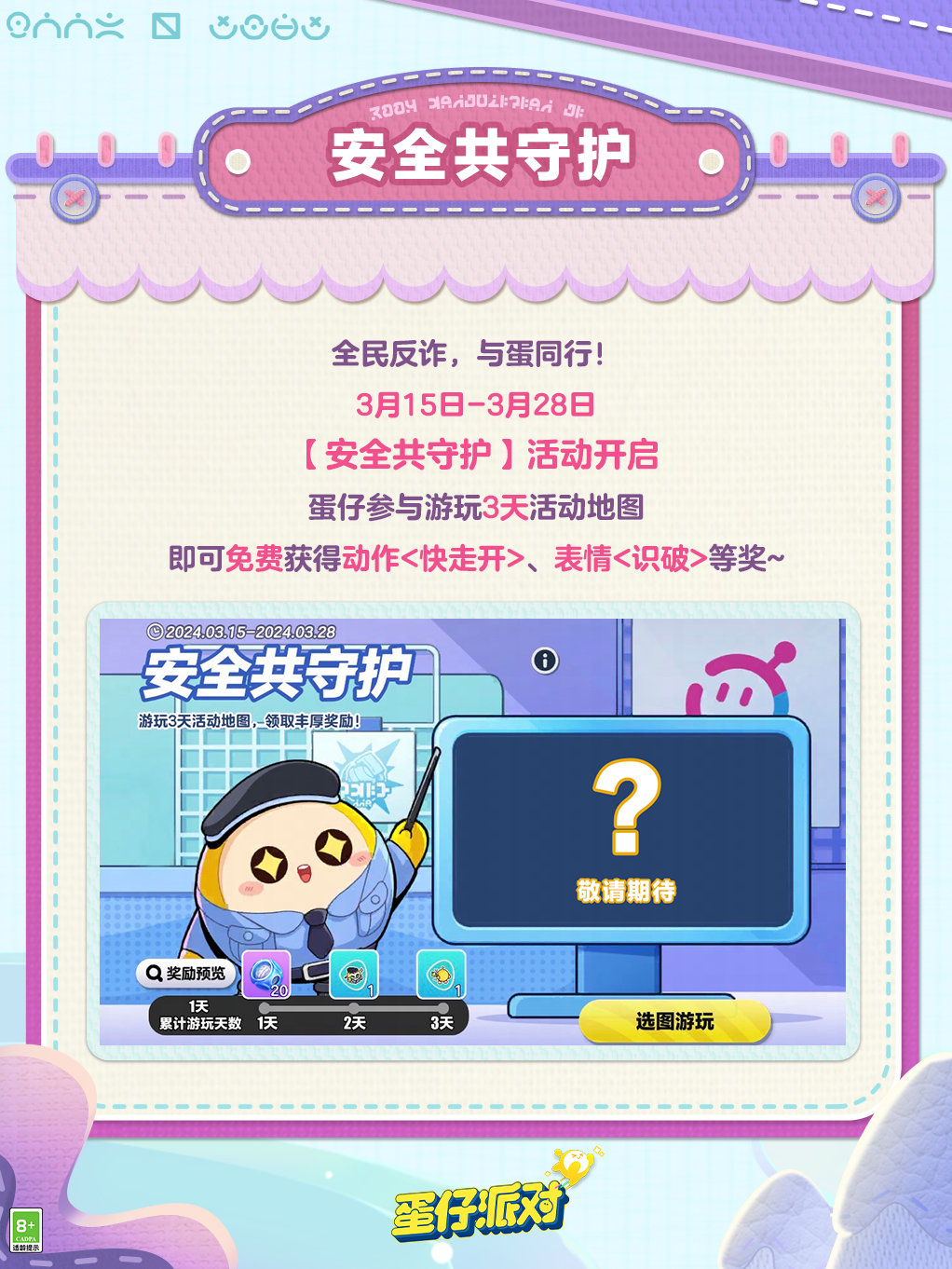 【安全共守护】活动开启,参与游玩3天活动地图,即可免费获得动作<快走开>、表情<识破>等奖励~