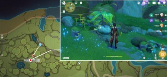 首先传送到桓那兰那的七天神像,之后转向正后方,朝西南方向走到图示位置,就可以看到「修梨薛那」(也就是这个图中长得有点像洋葱的东西)