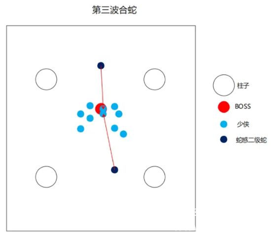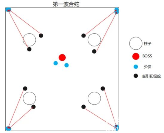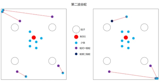 第一波蛇的出生位置在boss面向的前后两侧柱子旁,第二波蛇的出生位置在boss面向的左右两侧柱子旁。