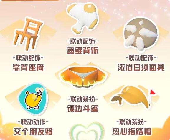 联动期间,蛋仔完成活动任务即可获得“蜡烛”,用以免费兑换联动装扮“镶边斗篷”、“热心指路帽”、联动配饰“浓眉白须面具”、“靠背座椅”、“遥鲲背饰”及联动动作“交个朋友蜡”!