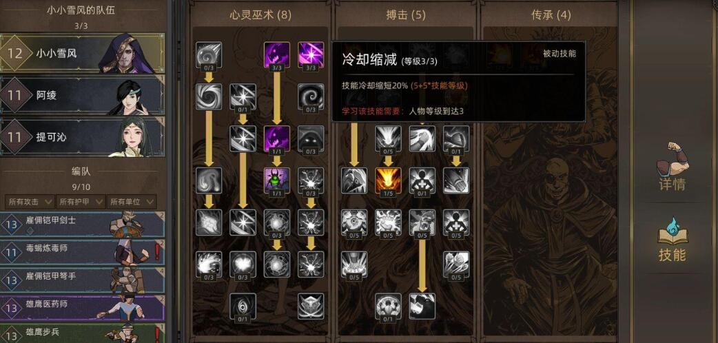 第二类技能是成长型技能,有自己的技能树,大部分的npc也是用的这三个技能树模板,外加一个专有的技能。共三个(冲锋 护卫 狂战士),每个都需要十个左右的技能点激活。