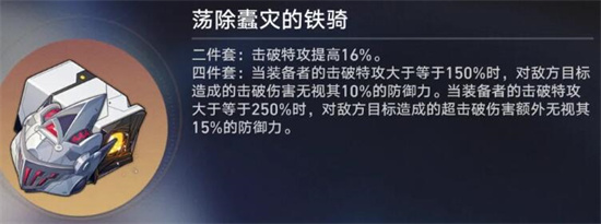 实战中击破流BUFF很多,很容易实现上三四百击破的实战面板,因此即使不打超击破,铁骑10%的无视防御也远比击破特攻加成更强,如果打超击破则能直接吃到25%的无视防御,收益极高。对于击破角色来说,铁骑套属于必刷的顶级套装。