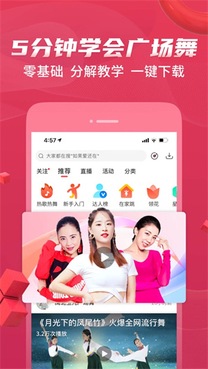 糖豆app去广告版是一款全民广场舞视频app,软件中有着海量的广场舞视频,用户可以通过软件来学习观看到各种的广场舞视频,让用户可以通过软件来了解学习到最新最热的广场舞视频。用户还可以根据软件中的"5分钟学广场舞"功能来进行快捷学习,软件中有着全国的名师来为用户进行教学,还为用户来分解动作进行一步一步的教学,让用户可以更快的学会。软件中还为用户提供了多种的基础健身操,来帮助用户来进行强身健体,还可以通过软件来进行家常美食的学习。