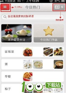 1.进入“下厨房”后,首页上方有个人中心,搜索以及购物清单