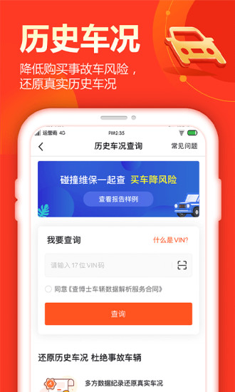 1、查询车辆历史信息:了解车辆是否存在水淹、火烧、调表、事故、召回等问题。