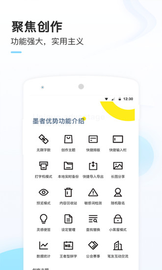 墨者手机版免费是一款可以让用户方便去进行创作的办公应用。用户可以选择多种免费的功能去使用,不论是敏感词监测,还是随机取名等,用户可以根据自己的情况去选择。用户可以选择多种不同的存储方式,这样可以让用户所创作的内容可以在很多的应用上去打开观看,还有相关的统计功能可以去计算用户花费多少时间去创作,或者每天创作了多少的字数,以及用户的创作中具有多少的字数等,更有各种不同的拼字模式可以让用户去使用,用户即使将一些文字内容误删了还是可以是用户回收站去进行恢复,当用户选择退出的时候会跟用户去去人同步的情况。