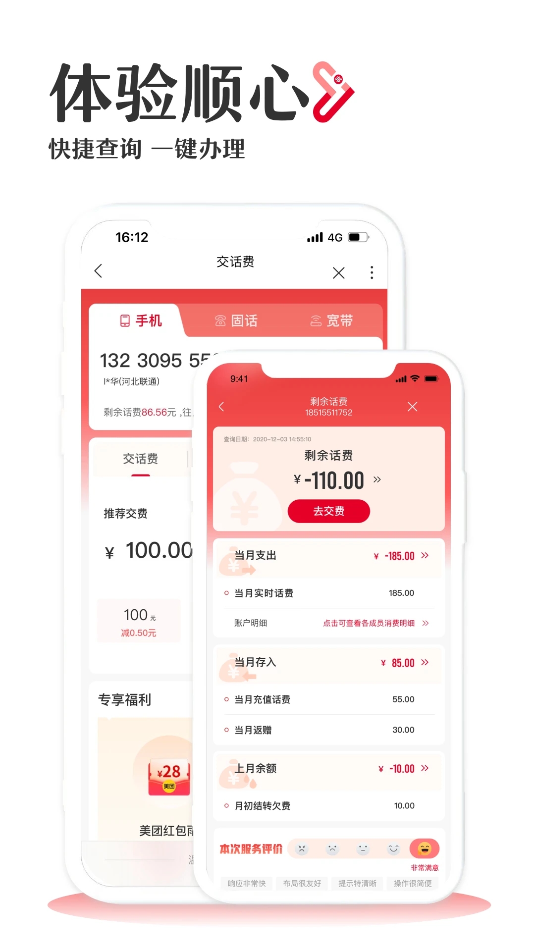 实时话费、套餐余量、缴费充值、宽带报装、5G办理……足不出户即可完成,让您体验“查得准,交得快,办得顺”的顺心服务;