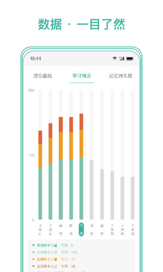 3、可以查看自己的记忆数据:遗忘曲线、记忆持久度、每日学习情况。