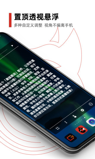 1、把内容置顶悬浮显示到屏幕上的实用性软件,且不会影响到其他应用软件的使用,特别适用于使用相机或抖音快手等软件的视频拍摄配合使用。