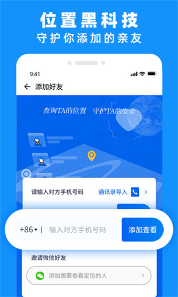 2、基于地理区域定位查找添加自己需要关心的好友,爱人,家人只需手机号一秒添加,轻松定位找人,安全守护。