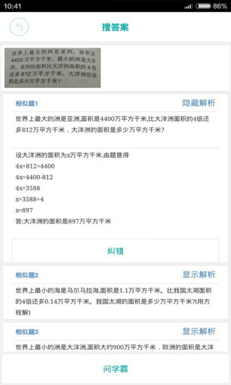百问搜题是一款超级好用的手机搜题解题软件,百问搜题拥有海量的题库,独家技术解题支持,完成快速搜题。解题答案专业老师编制,准确率高且还有详尽的答案解析,提供的不仅仅是解题的步骤,更是答题思路和解题技巧。多种搜题方式,文字、语音、拍照等,一定有适合你的一款。拍照搜题特别好用,就连手写的也可以马上识别得到答案。还有历年真题题库,是学生的练兵场,让学生充分练习。百问搜题自动记录搜题记录,为学生更好的学习提供了便利,是学生提高成绩的神器。