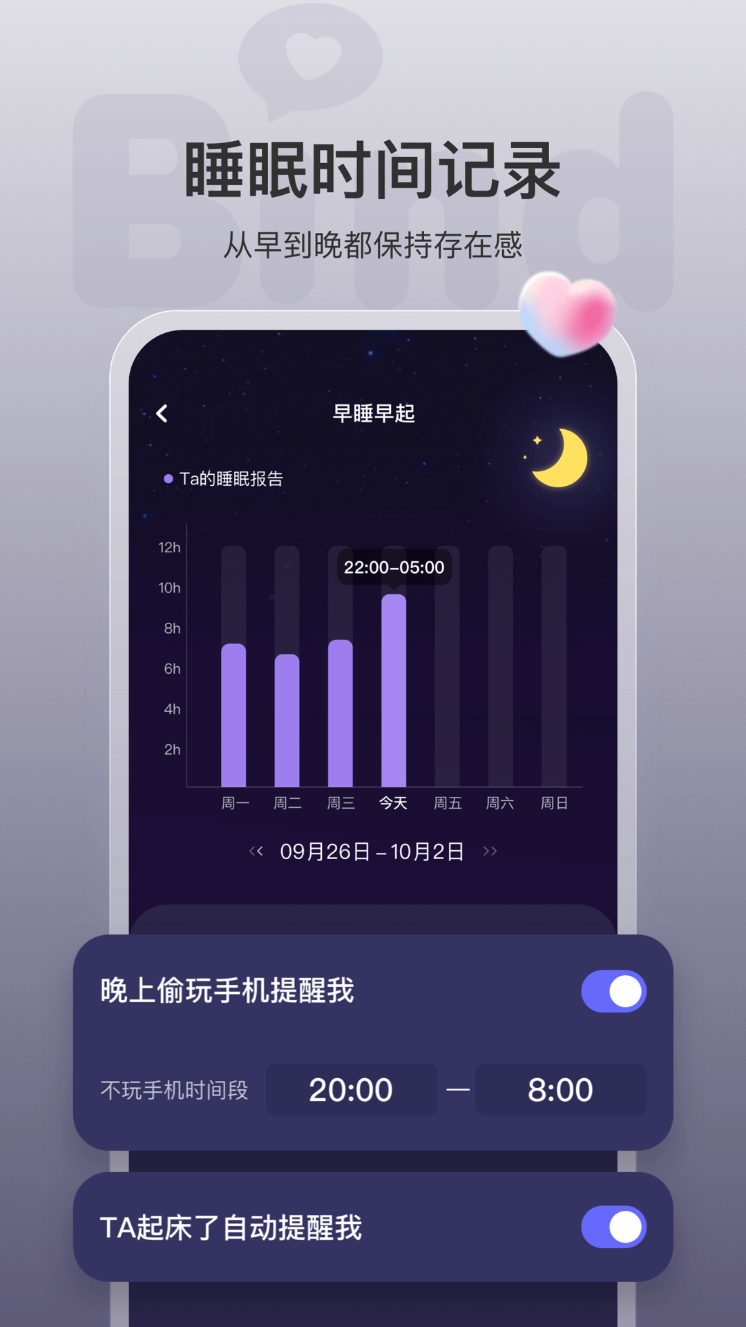 Bind软件下载安装是一款专门为情侣,尤其是异地情侣所设计的互动向手机app,有着极为丰富的功能项目设计,极为有趣的玩法内容设定来为用户与用户的那个TA能够拥有更多的乐趣的Bind软件下载安装,除了最为常见的一起看电影功能所提供的不同空间但是同时间同进度的观影体验以外,像是定位系统所带来的实时位置分享,像是实时场景状态服务所提供的对另一边的那个TA所处的环境,天气以及TA所进行的步数记录等信息的直接传达,像是对屏幕那边的TA一天所用手机的时长,所用手机的时间段甚至是起床与否的状态提醒都能够实时的汇报,让双方都能够像是就在对方身边一般亲密,还是非常甜蜜的,推荐喔~